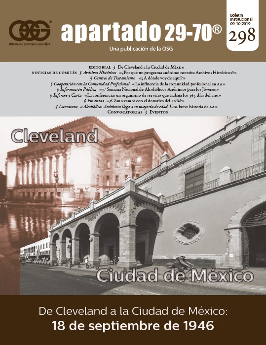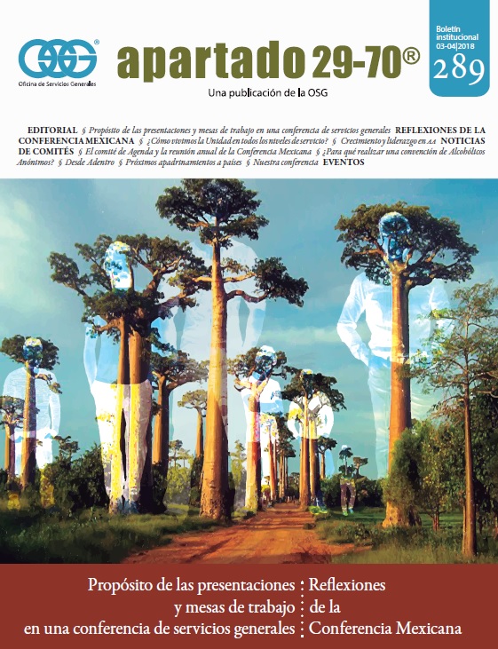 Boletín apartado 29-70 es un órgano de información y servicio a la comunidad de Alcohólicos Anónimos, publicado cada dos meses por la O.S.G. de México. Se distribuye gratuitamente a todos los grupos de Alcohólicos Anónimos que se encuentran registrados en la Central Mexicana de Servicios Generales de Alcohólicos Anónimos, A.C. Si deseas obtener una suscripción personal por un año ponte en contacto con la O.S.G.