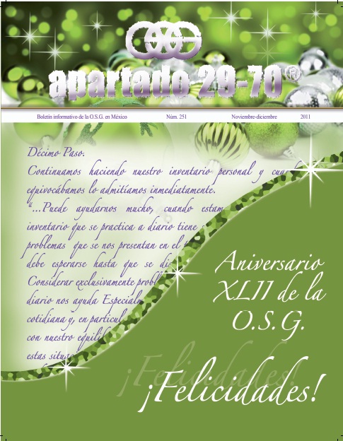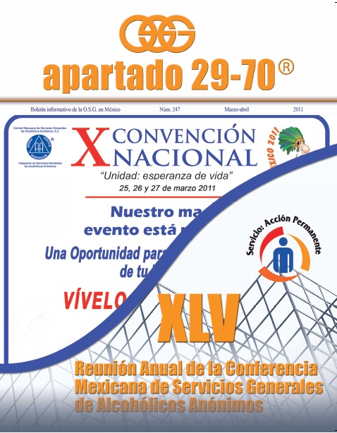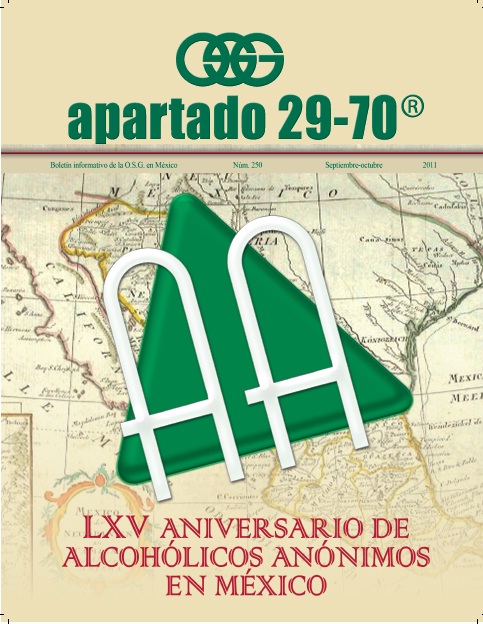 Boletín apartado 29-70 es un órgano de información y servicio a la comunidad de Alcohólicos Anónimos, publicado cada dos meses por la O.S.G. de México. Se distribuye gratuitamente a todos los grupos de Alcohólicos Anónimos que se encuentran registrados en la Central Mexicana de Servicios Generales de Alcohólicos Anónimos, A.C. Si deseas obtener una suscripción personal por un año ponte en contacto con la O.S.G.